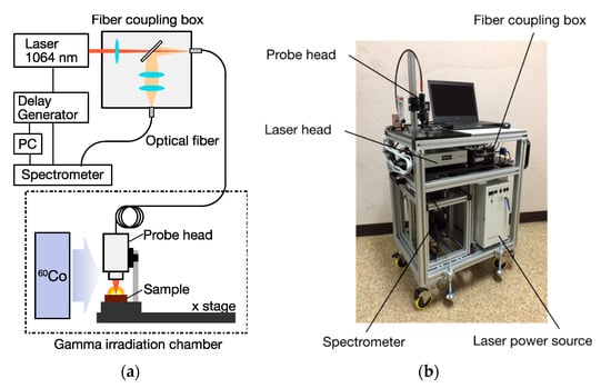 Laser-induced breakdown spectroscopy (LIBS) is an elemental analysis technique based on plasma emission spectroscopy [6,7,8]. In LIBS, the output of a pulsed laser is focused onto the target material to generate a luminous plasma. The optical emission from the plasma is then collected with a spectrometer for qualitative and quantitative elemental analysis. Because LIBS allows us to perform remote and rapid measurements with little or no sample preparation, there have been continuous efforts to apply LIBS to nuclear material analysis [9,10,11,12]. In particular, fiber-optic LIBS (FO-LIBS), which employs fiber optics to deliver laser light and collect plasma light [13], is considered suitable for the direct analysis of radioactive debris because it provides flexible access to a variety of samples in hazardous environments. We recently developed a portable FO-LIBS system originally aimed at the remote analysis of underwater samples in a harsh environment [14]. While several of our studies have demonstrated the capability of our system for analyzing various samples [14,15,16], measurements in a radiation field have yet to be explored. Therefore, further examination is necessary for the FO-LIBS approach to the analysis of the nuclear fuel debris.