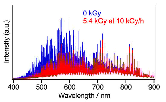Figure 2 displays the representative LIBS spectra of the surrogate debris (sample #5) measured before and during gamma irradiation. The spectrum during irradiation was recorded when the accumulated dose reached 5.4 kGy at 10 kGy/h. The spectral profiles appear congested, originating from the prominent lines of Ce and Zr, along with the minor lines of Fe and N. As shown in Figure 2, gamma irradiation decreased the LIBS signal, particularly in the UV-Vis region (λ < 800 nm). The wavelength range of the degradation was consistent with that observed in the transmission attenuation of the optical fiber induced by gamma irradiation. Figure 3a shows a spectrum of the transmission loss of the optical fiber induced by gamma irradiation. It was measured in a separate experiment using a brand-new fiber, a halogen lamp (USS-600, Labsphere, North Sutton, NH, USA), and multichannel spectrometers (EPP2000-HR and BLUE-WAVE, StellarNet, Tampa, FL, USA). The decrease in the LIBS signal was thus attributed to the damage to the optical fiber. Radiation-induced damage in optical fibers has been the target of several studies [20,21,22,23,24]; in particular, the gamma-ray dissociates Si-O bonds of silica in the fiber, which yields various types of radical species playing the role of color centers. The formation of these color centers attenuates the optical transmission of the fiber, particularly in the UV-Vis region [24]. By contrast, transmittance at the infrared region proved resistant to gamma irradiation (Figure 3a). Accordingly, transmission at 1064 nm (the wavelength of the excitation laser) remained almost intact, as shown in the temporal change of the transmission loss at 1064 nm (Figure 3b).