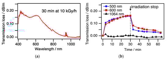 Transmission loss of the optical fiber induced by gamma irradiation (10 kGy/h). (a) Spectrum of transmission loss after 30 min irradiation. The fluctuations at around 950 nm originated from the inherently low transmittance of the high-OH fiber due to the strong photoabsorption of OH. (b) Time evolution of the transmission loss at 500 nm (blue circle), 600 nm (red square), and 1064 nm (black triangle). The gamma irradiation was stopped at 30 min.