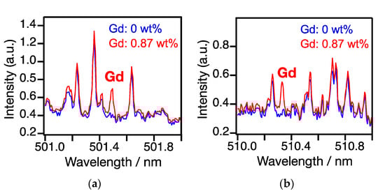 The Gd spectral lines applicable to Gd identification were determined by comparing the LIBS spectra of samples #1(Gd: 0 wt%) and #5(Gd: 0.87 wt%), measured without gamma irradiation. The obtained spectra contained the optical emissions from neutral Gd (Gd-I lines). In contrast, the ionic lines (Gd-II lines) were very weak, probably because the plasma temperature was not high enough to populate a sufficient amount of Gd in its ionic state at a 1 µs delay time between the laser irradiation and the spectral detection. Although the numerous Gd emission lines are present at λ < 700 nm [25], most of them suffered from severe spectral interference with the lines of the other elements in the surrogate debris. As seen in Figure 4, the lines at 501.5 and 510.3 nm are well separated from the others. Those lines are not associated with resonance transitions, minimizing the influence of self-absorption. Note that the emission lines of uranium are absent in the close vicinity of those Gd lines [25,26], which can therefore be used for Gd identification.