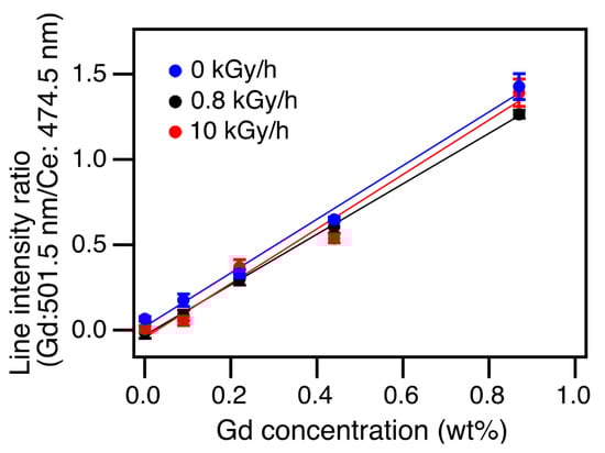 The absolute intensities of those lines were not suitable for Gd quantification in the present work because they were not scaled with the concentration of Gd due to the disturbance from gamma irradiation. In addition, even in the five repeated measurements for a given sample, the relative standard deviation (RSD) values became high at a high dose rate. For example, the RSD of the Gd 501.5 nm line of sample #5 was evaluated as 8.9%, 16.2%, and 27.5% at 0, 0.8, and 10 kGy/h, respectively. To derive Gd calibration curves under such fluctuating conditions, the intensity ratio of Gd and Ce lines were employed as a measure of Gd concentration rather than the absolute intensities. The pair of spectral lines were selected as the 501.5 nm line (Gd) and 474.5 nm line (Ce). This selection is based on the similarity between the upper-level energies for the two emission lines: 3.58 eV for the Gd 501.5 nm line and 3.53 eV for the Ce 474.5 nm line [25,26]. This mitigates the influence of the fluctuation of the plasma conditions [27]. The intensity ratios were calculated using the peak heights with baseline subtraction, yielding lower RSDs than the absolute spectral intensities: 5.0%, 1.8%, and 5.0% at 0, 0.8, and 10 kGy/h, respectively.