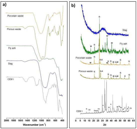 - Hybrid materials: these mortars were composed of ordinary Portland cement (20 wt %) and industrial and ceramic wastes (fly ash, blast furnace slag and two ceramic wastes), of which the amount was 80 wt % Furthermore, in these hybrid systems, a percentage of Na2SO4 (at 3% and 5 wt %) was added to favor the hydration process of the materials. Water was used as the activating solution.