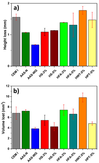 - Most of the alternative hybrid systems proposed showed an improvement in durability to abrasion compared to Portland cement (CEM I), highlighting the behavior of AAS-WG and HS-5%.