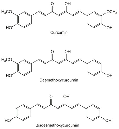 Turmeric dry rhizome is composed mainly of starch, having also, in lesser extent and in varying composition according to geoclimatic factors, carbohydrates, proteins, lipids, fiber, curcuminoid pigments, sesquiterpenes (turmerone, atlantone, zingiberone, turmeronol, germacrone, α-curcumene, β-sesquiphellanderene, bisacurone, curcumenone, dehydrocurdione, procurcumadiol, bis-acumol, curcumenols, zedoaronediol, bisabolene, and curlone), and caffeic acid [,]. The curcuminoid content typically varies between 2% and 9%. Curcuminoids are biosynthesized by condensation of malonic acid with cinnamoyl CoA or p-coumaroyl CoA. Curcumin is the most abundant curcuminoid in turmeric, but traces of its precursors, desmethoxycurcumin and bisdemethoxycurcumin (Figure 1), are also present []. Curcumin and its analogues can be found in several other Curcuma species as well as in a few species from other genera. Sources of curcuminoids include Curcuma mangga, Curcuma zedoaria, Costus speciosus, Curcuma xanthorrhiza, Curcuma aromatic, Curcuma phaeocaulis, Etlingera elatior, and Zingiber cassumunar []. C. mangga, commonly named mango ginger, is indicated as a good dietary source of curcumin, but it is still far from reaching the widespread reputation of turmeric as a dietary supplement and functional food.