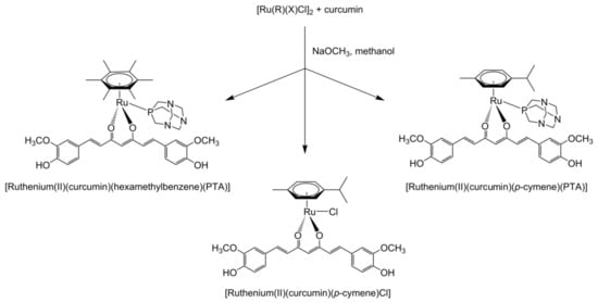 - Pettinari, R.; Marchetti, F.; Condello, F.; Pettinari, C.; Lupidi, G.; Scopelliti, R.; Mukhopadhyay, S.; Riedel, T.; Dyson, P.J. Ruthenium(II)–Arene RAPTA Type Complexes Containing Curcumin and Bisdemethoxycurcumin Display Potent and Selective Anticancer Activity. Organometallics 2014, 33, 3709–3715. [Google Scholar] [CrossRef]