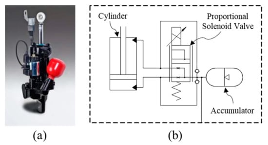 Hydro-pneumatic semi-active suspension: (a) Figuration and (b) hydraulic circuit diagram.