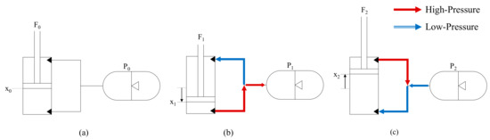Conceptual diagram of hydraulic oil movement according to cylinder movement direction: (a) neutral (b) compression and (c) extension.