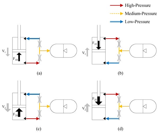 When a force in the extension direction was applied to the suspension, the cylinder moved in the extension direction, as shown in Figure 2c, and the hydraulic oil escaped from the cylinder rod chamber and entered the cylinder head chamber. In this case, because the amount of hydraulic oil was less than the volume of the rod, the hydraulic oil in the accumulator escaped and moved to the cylinder head chamber. As the gas inside the accumulator expanded, the pressure in the hydraulic system decreased and then stopped until the force was re-equilibrated.