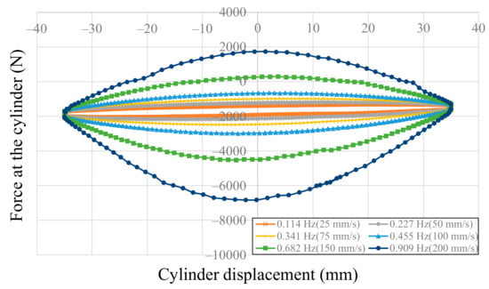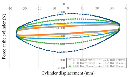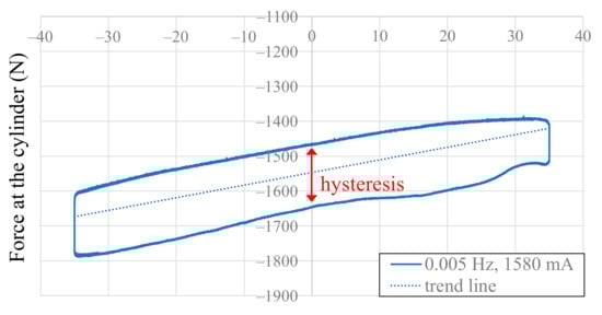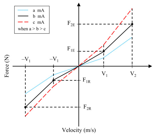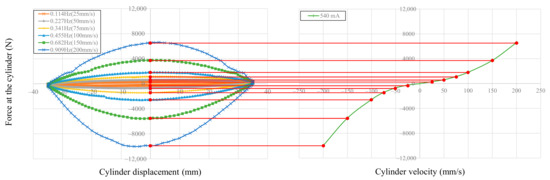 Figure 16 shows how the force-velocity diagram was obtained from the test results for the input current of 540 mA. The y-axis deviation offset in the negative direction caused by the initial retractive force was corrected to the origin, and the y-intercept value measured when the displacement x was zero in the test results for obtaining the force-displacement diagram was moved to the force-velocity coordinate plane. For example, the positive y-intercept is 6596 N and the negative y-intercept is −10,010 N in the graph of the test results reciprocating at 200 mm/s. From these values, two points were obtained in the force-velocity diagram: (200, 6596) and (−200, −10,010). Two points could be obtained in the same way for each velocity condition, and if all points were connected, a force-velocity diagram could be obtained, as shown on the right side of Figure 16.