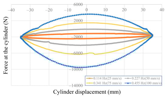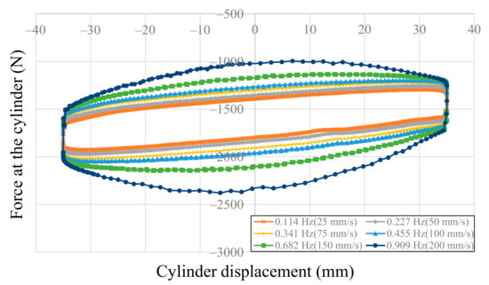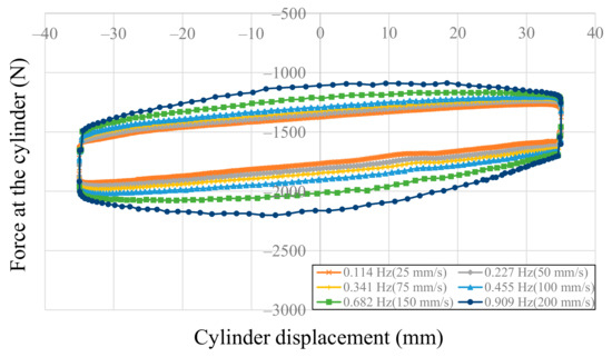 Because it is impossible to generate the desired velocity by moving the cylinder in one direction only, owing to the limitation of the cylinder stroke, the desired velocity was implemented through reciprocating motion with sinusoidal displacement. The displacement of the sinusoidal wave with constant amplitude and frequency can be expressed as Equation (5), and the velocity can be obtained using Equation (6) by differentiating Equation (5). Owing to the characteristic of the sinusoidal function, the velocity became maximum when the displacement became zero. The maximum velocity is given by Equation (7). For example, when the amplitude was 35 , in order to generate the maximum velocity 25 at the point where the displacement is zero, according to Equation (7), , thus the frequency had to be 0.114 . Substituting Equation (7) into Equation (1), the relationship between the maximum force and the damping coefficient can be obtained as in Equation (8). If the amplitude of the displacement waveform was constant, the maximum velocity when passing through the point where the displacement was zero could be known, and the damping coefficient could be obtained by measuring the maximum force generated at this time and dividing it by the velocity.