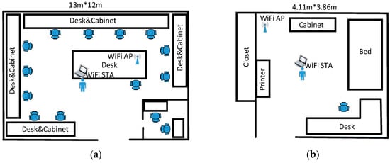 Measurement scenes of the lab and home environments. (a) Lab environment. (b) Home environment.