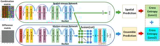 The proposed dual-output two-stream network is shown in Figure 4. In total, two types of modality data, combination matrix and difference matrix, were input into the network. In this study, the ResNet model was used for two stream CNNs. The convolutional layers in CNNs extracted multiple levels of features. When two streams are fused by concatenation, the attention mechanism (CBAM) [] module will automatically select the most descriptive features learned by the two stream networks. Then, batch normalization (BN) is used to prevent overfitting. The ensemble prediction was the final output, as shown in the bottom layer of Figure 4. The two cross-entropy losses were combined to optimize the learning process. The dual-output and two cross-entropy losses in this structure mainly borrowed the ideas of GoogleNet architecture. The additional classification network mainly provided gradient training for the previous convolution. When the network deepens, the gradient cannot be effectively transmitted from back to front, and network parameters cannot be updated. Such a branch can alleviate the gradient propagation problem.