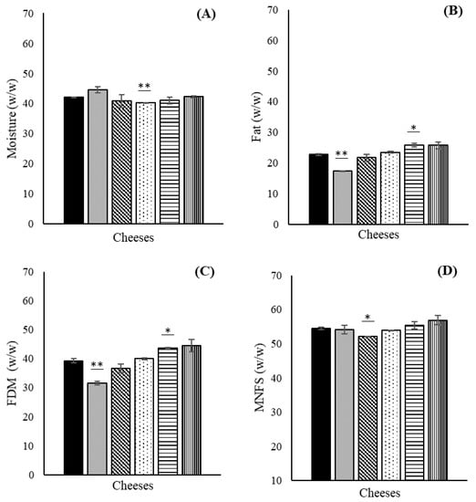 Physicochemical composition in percent of the experimental costeño-type cheese: (A) Moisture; (B) Fat; (C) Fat-in-dry-matter (FDM); (D) Moisture-in-non-fat-substances (MNFS) in QC (black bar), Q1 (gray bar), Q2 (diagonal striped bar), Q3 (point bar), Q4 (horizontal striped bar) and Q5 (vertical striped bar). Error bars represent one standard deviation. Student’s t-tests were performed to assess significance compared to the control cheese (QC), where (*) corresponds to a p-value < 0.05, and (**) to a p-value < 0,01.