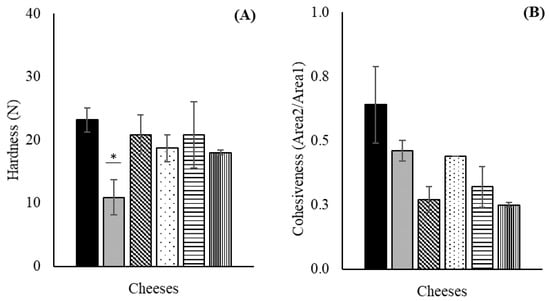 Texture attributes of costeño-type cheese: (A) hardness; (B) cohesiveness. QC (black bar), Q1 (gray bar), Q2 (diagonal striped bar), Q3 (point bar), Q4 (horizontal striped bar), and Q5 (vertical striped bar). Error bars represent standard deviation. Student’s t-tests were performed to assess significance compared to the control cheese (QC), where (*) corresponds to a p-value < 0.05.