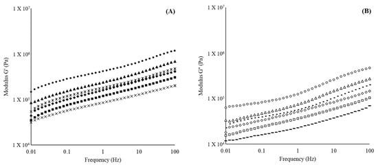 An increase in the storage and loss modulus was evident and proportional to the increase in frequency, demonstrating dominant viscoelastic properties (Figure 3A,B). These observations agree with previous rheological research in cheeses [31,39]. Figure 3 also shows a correlation between rheological behavior and NaCl’s addition in the cheese—except for Q1, which showed low storage modulus compared to Q2, which had a smaller NaCl addition.