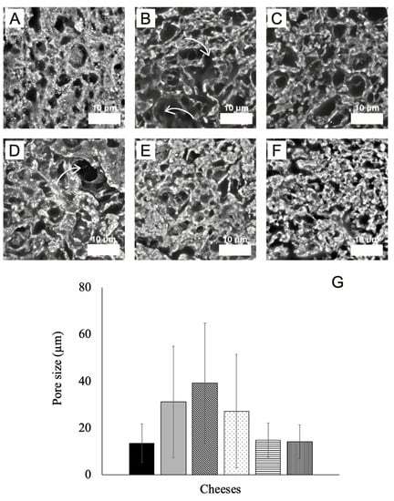 Scanning electron micrograph of costeño-type cheese at 10 µm scale at 4500x. Qc (A), Q1 (B), Q2 (C), Q3 (D), Q4 (E), Q5 (F), and average pore size (G), where error bars represent one standard deviation. The light areas in the micrograph are the protein phase, and the dark areas are the fat or serum phase. Arrows indicate coalesced fat globules.