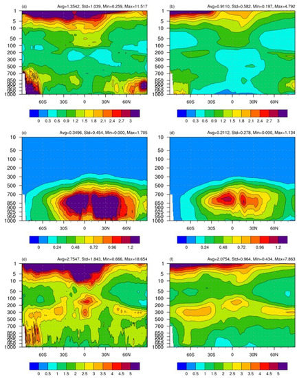 In Figure 4, we show the effect of our proposed scheme on the accuracy of EDA, by showing the zonal mean differences of ES and EME between STO and CTL for the 6 h forecasts during the experimental periods. As expected, in most areas the ES increased (red) while the EME decreased (blue). It is noteworthy that, for all variables, the EME significantly decreased (i.e., the accuracy increased) over the tropics, especially below 700 hPa (Figure 4b,d,f). For temperature, the accuracy increased over higher latitudes as well in the lower atmosphere while it prominently decreased in the stratosphere over the SH (Figure 4b); for zonal wind, the accuracy also increased in the middle to upper troposphere but decreased in the stratosphere over the tropics while it generally decreased at high latitudes, especially over the SH ( 60 S) (Figure 4f). The ES generally enlarged in all variables: for temperature, the ES substantially increased in most latitudes and atmospheric layers except in the mid- to upper-troposphere and over the low-level tropics ( 10 S– 10 N) below 700 hPa (Figure 4a); for specific humidity, the ES was mostly enhanced within the mid-latitudes below 700 hPa (Figure 4c); for zonal wind, the ES was significantly augmented in most of the global atmosphere, especially in the subtropical troposphere below 700 hPa and in most of the stratosphere except over 40 S– 10 N (Figure 4e). For the mass variable variation, the SPDT acts indirectly through the mass-wind balance and the cycling, thus having a weaker impact on the temperature and specific humidity than the SPPT, while the wind field variation is induced comparably by both SPDT and SPPT.