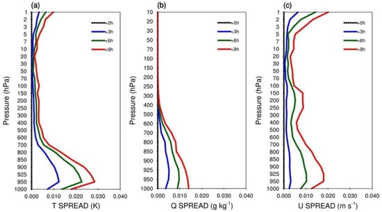 Figure 3. Differences in the ES between stochastic perturbation run (STO) and CTL (i.e., ES STO -ES CTL ) in the globally averaged vertical profiles of (a) temperature (in K), (b) specific humidity (in g kg 1 ), and (c) zonal wind (in m s 1 ) for forecast times of +3 h (blue), +6 h (green), and +9 h (red) from the initial time (+0 h; black dots) at 12:00 UTC on 22 June 2018. Variations in the ES reflect the effect of the new SPHT scheme.