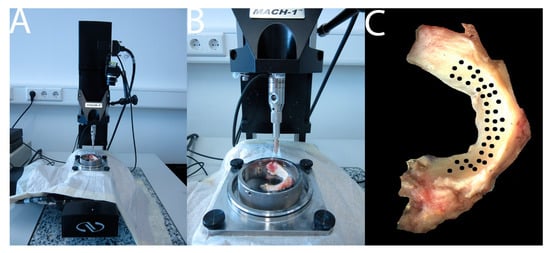 The mechanical characterization of the menisci was carried out by means of automated mapping [22] based on indentation tests (DIN EN ISO 14577) [19,20]. A Mach-1 Model V500css test device (Biomomentum Inc., Montreal, QC, Canada), a multiaxial load cell with 17 N Model MA 233 (ATI industrial Automation, Apex, NC, USA) and Newport Motion Controller ESP 301 (Newport, Irvine, CA, USA) were used. The tests were displacement-controlled. This testing machine enables the examination of soft tissue. Based on Hayes [23], the resulting modulus is the instantaneous modulus (IM). IM, thickness and maximum load of the tissue were examined [22,24]. The maximum applied load was defined as the highest load registered by the load cell per measuring point. The menisci were fixed on to the MA646 specimen holder (Biomomentum Inc., Montreal, QC, Canada) by Loctide (Henkel AG & Company KGaA, Duesseldorf Germany) according to physiological circumstances and were then anchored in the testing device. The adhesive triggered no mechanical or structural changes in the meniscus and could be removed without leaving any residue after the measurements. After the samples were fixed in the testing machine, the measuring points were determined. For this purpose, each mounted meniscus was photographed with an HD camera (Biomomentum Inc., Montreal, QC, Canada). In the Mach-1 Analysis Software Version 4.1.0.17 (Biomomentum Inc., Montreal, QC, Canada), a position grid adapted to every meniscus could be projected on to the images. The position grid was created for each meniscus depending on its shape and size. The indentation test was then carried out by testing every determined point with the Mach-1 Motion Software 4.3.1.8 (Biomomentum Inc., Montreal, QC, Canada) using a spherical indenter MA680 (Biomomentum Inc., Montreal, QC, Canada) of 1 mm diameter. In contrast to previous studies, the entire menisci were examined. When testing the meniscus, an average of 45 measuring points was created in the position grid, comparable to Sim et al. [22] and Seidenstuecker et al. [25] (see Figure 1).