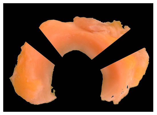 After the mechanical tests, the menisci were cut into the following sections: anterior horn, middle section and posterior horn (see Figure 3). Two samples were taken from each section, one for transversal and the other one for longitudinal thin sections. The samples were fixed overnight in 4% formaldehyde solution and then dehydrated. The samples were embedded in paraffin so that both transverse and longitudinal sections could then be made per third. Using a Leica RM2255 rotational microtome (Leica Biosystems, Wetzlar, Germany), two 4 µm thin sections were made per specimen.
