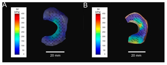 Mapping of instantaneous modulus (IM) in arthritis-free samples (A) and arthritic meniscus (B).