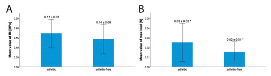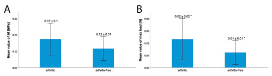 Comparison of the IM in MPa (A) arthritic: 0.17 ± 0.1 MPa; arthritis-free: 0.12 ± 0.07 MPa (p = 0.06) and maximum applied load (B) arthritic: 0.02 ± 0.02 N; arthritis-free: 0.01 ± 0.01 N over the posterior horn of the meniscus between menisci (p = 0.01), taken in total knee replacements (TKR) due to osteoarthritis and menisci, taken from donors without osteoarthritis as a control group: * = statistically significant difference with p < 0.05; error bar with +/− 1SD.