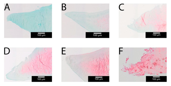 Examples for the Safranin O (SO) score 0–5 (A–F) for longitudinal cuts taken with 4x magnification; (A) Grade 0: no SO staining; (B) Grade 1: minimum SO staining; (C) Grade 2: very weak SO staining; (D) Grade 3: weak SO staining; (E) Grade 4: strong SO staining; (F) Grade 5: very strong SO staining; A+B corresponds to the arthritis-free group and C–F to the arthritic group.