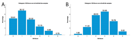 Histogram of all arthritis-free SO stained sections (A); Histogram of all arthritic SO stained sections (B).