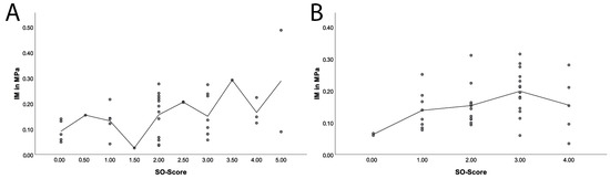 Scatterplot with adjustment line concerning the correlation between SO score and IM over the posterior horn of the meniscus (A) and the entire meniscus tissue (B) for all samples (arthritic and arthritis-free).