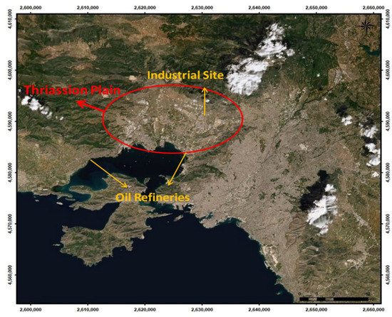 The sampling campaign was performed in the industrial city of Eleusis located at central Greece, with a population reaching approximately 25,000 people according to a 2011 census. Eleusis is in the heart of Thriassion Plain, the largest industrial area in Greece, approximately 18 km northwest from the center of Athens (the capital of Greece) (Figure 1). It is the place where the majority of crude oil in Greece is imported and refined. Within this area, the largest crude oil refineries are located, and over 300 industrial plants, referring to metallurgical processes, cement, chemical and food production plants, shipyards, etc., are situated. A recently imposed environmental pressure on the surrounding area is the illegal uncontrolled combustions that take place in the neighboring industrial site of Aspropirgos for the recovery of raw materials by burning tires, electronics, plastics, etc. [35,36].