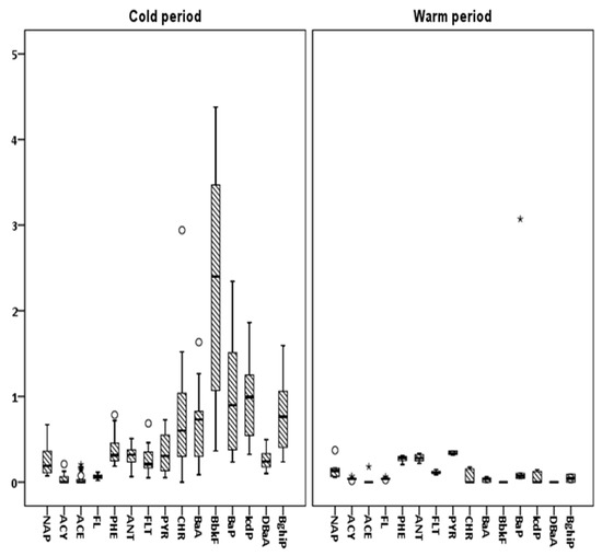 PAH seasonal variations in ng m−3 (* outliers and o values above 3rd quartile).