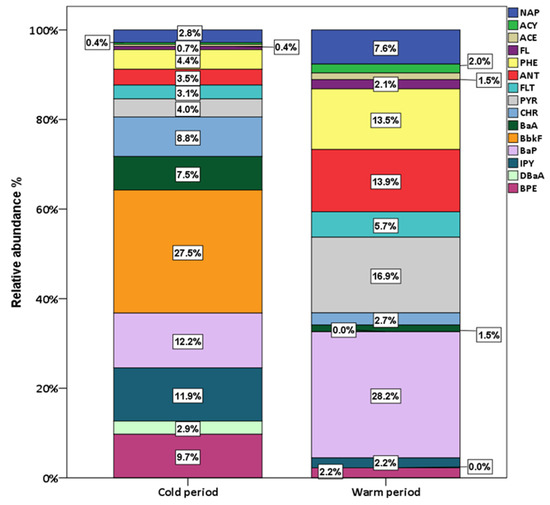 In Figure 3, the relative contribution of each compound is presented for both sampling periods. Obviously, 5–6 rings PAHs were the most abundant species during cold period, accounting for about 80% of the ΣPAHs, while the percentage is about 30.4% in the warm period dominating by the low molecular weight PAHs. This inversion may be a result of the decreased emissions from combustions related with central heating during the warm period. The dominance of petrogenic low molecular weight PAHs, especially with 3–4 rings, in the warm period may be affected also by emissions from petroleum depositories from oil refineries and cargo ships [49,67,68] that both constitute a constant factor in the area working all year long. The most abundant PAH during the cold period was BbkF 27.5% followed by BaP 12.2%, while in summer BaP remained the dominant PAH with 28.2% relative abundance, followed this time by petrogenic ANT and PHE with 13.9 and 13.5%, respectively (Figure 3). BbkF and BaP were also the most abundant compounds in other studies in Aspropirgos [36], Athens [66], Volos [49], Greece, in Dunkirk, France [31], and Sao Paolo, Brazil [41].