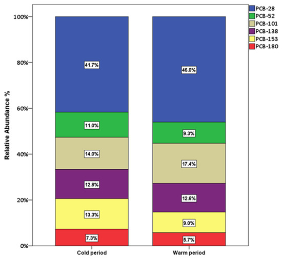 As for the indPCB’s seasonal variations, none of the six congeners presented statistically significant differences (p values were >0.05) between the cold and warm periods, with the concentrations for both seasons being included in Table 2. The indPCBs also did not present any alteration regarding their relative abundance, with PCB28 being the most abundant congener in both sampling periods (41.7 and 46.0%, respectively) (Figure 4). The indPCBs profile also indicates a marked decrease in concentration with increasing chlorination for different congeners. The same outcome was highlighted also by Colombo et al. (2013) in the highly industrialized city of Brescia, in northern Italy [23].
