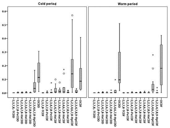 Discussion on the congener profile of PCDD/Fs during the warm and cold periods will be based on Figure 7. The most toxic congener, 2,3,7,8-TCDD, was not detected in any sample. The congener profiles demonstrated the prevalence of OCDF, OCDD, 1,2,3,4,6,7,8,-HpCDF, and 1,2,3,4,6,7,8-HpCDD for the entire sampling period. The relative abundances of these four compounds were 19.7–58%, 23.1–26.0%, 8.7–29.6%, and 2.2–7.7%, respectively. The results are in agreement with those from other studies in industrial sites in Shanghai [55] and Anshan [38], China, in Seoul, Korea [64], and in Umm-Al-Aish oil field, Kuwait [20].
