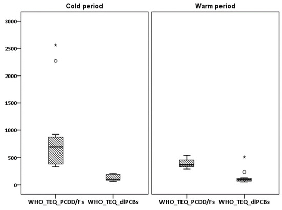 WHO-TEQ2005 seasonal variations for PCDD/Fs and dlPCBs (* outliers and o values above 3rd quartile).