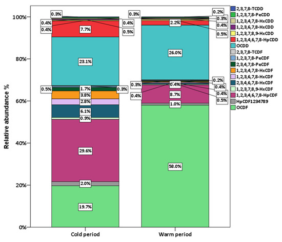 Relative abundance among PCDD/F congeners for the cold and warm periods.