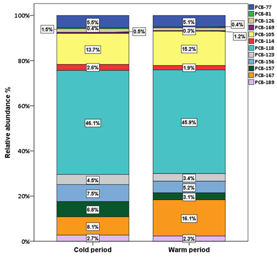 Relative abundance among dlPCB congeners for the cold and warm periods.