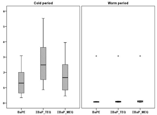 Seasonal variation of BaPE, ΣBaPTEQ, and ΣBaPMΕQ (* outliers).