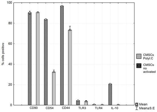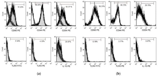 | Phenotype Expression of Markers [%] | CD90 [%] | CD44 [%] | CD54 [%] | TLR4 [%] | TLR3 [%] | IL-10 [%] |