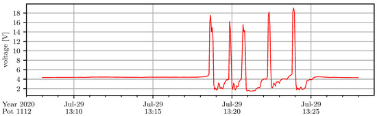 Example of voltage behaviour during an anode effect (AE) with four restarts from train dataset.