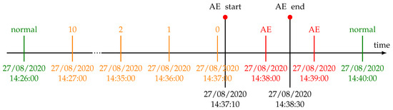 After feature generation and the resultant determination of the smallest time step between two samples, it was possible to label the data. An example of the data labeling is shown in Figure 5. The timestamp of the AE start is available with a resolution of seconds. All samples where the timedelta until AE start is less than 1 min is labeled as 0. All samples where the timedelta until AE start is at least 1 min up to 2 min is labeled as 1. This procedure continues until the label 10 is generated. The timestamp of AE termination is also available with a resolution of seconds and is rounded up to the next full minute. All samples that are between the AE start and the modified AE end get the label AE. Finally all other samples are labeled as normal. To create the final dataset only samples with the label 1 (minority class) and normal (majority class) are kept. This ensures that the lead time is at least 1 min.