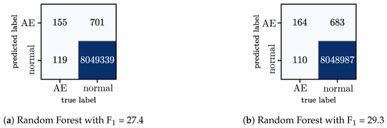 These combinations are shown in Table 3. In general it can be observed that the Random Forest Classifier always turns out to be the best model. If no time series features are used (#1) the score is low. The same applies if the RandomUndersampler (#2, #12) or NearMiss-1 (#3, #13) is used. NearMiss-2 could not be tested due to excessive memory consumption. The best results are obtained by the use of time series features and NearMiss-3 with an IR of 9 (#6, #16). The confusion matrices of these two best models regarding F1 score can be seen in Figure 6.