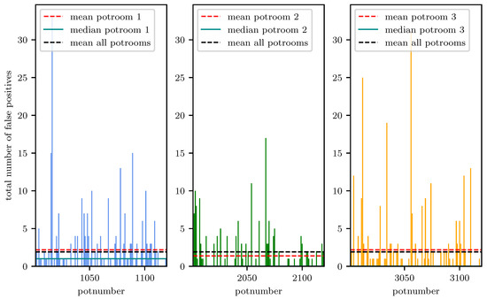 Because the number of false positives is higher than the true positives it was decided to do a post analysis. For the analysis the best model was chosen (#16, see Table 3). First of all the distribution of false positives dependent on the potnumber is investigated, shown in Figure 7. It can be observed that the false positives are not uniformly distributed. Some potnumbers exhibit considerably more false positives than others. One reason for this is the accumulation of false positives in groups of consecutive time steps. Among the potrooms the differences are small. A further analysis on a sample basis regarding the prediction over time shows that some false positives are related to events like anode change, metal tapping and current drop. Disabling the model for 3 h after restart in consequence of a current drop and for 30 min after anode change can improve the score slightly. Disabling the model during other events does not increase the scoring. Removing false positives if the prediction is up to 30 min in advance also yields an improvement.