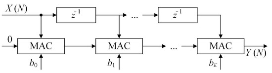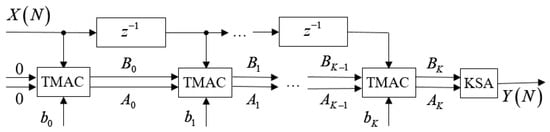 The FIR DF scheme based on TMAC units is shown in Figure 6. Two zero signals must be fed to the inputs of the first TMAC unit, and outputs and of the last TMAC block must be fed to the input of the KSA.