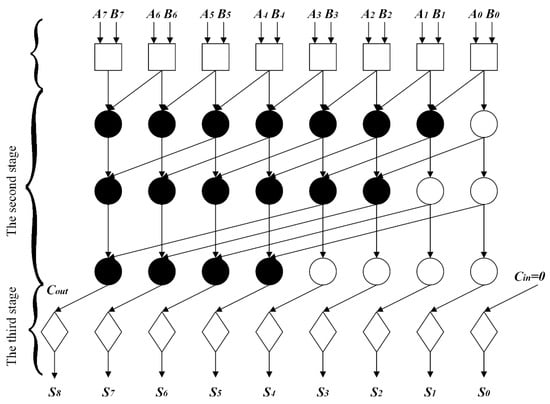The structure of the 8-bit parallel-prefix Kogge–Stone adder.