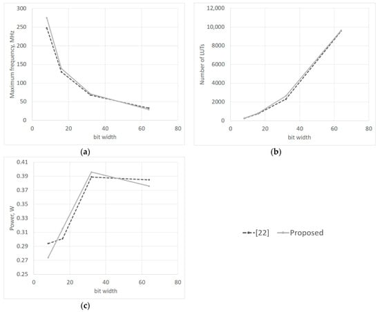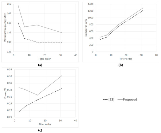 Results of the hardware simulation of FIR DFs are shown in Figure 7 and Figure 8, which demonstrate that using TMAC units in the implementation of FIR DFs allowed for an increase in the devices’ maximum clock frequency by 4.41–10.89%, but at the same time, the hardware costs increased: the number of used look up tables (LUTs) by 0.63–18.63% and power consumption by 1.80–27.17%. The difference between theoretical and practical results is explained by the FPGA features and the weaknesses of the “unit-gate” model, which include ignoring the effects of the load outputs capacity of individual logic units and the circuit, generally.