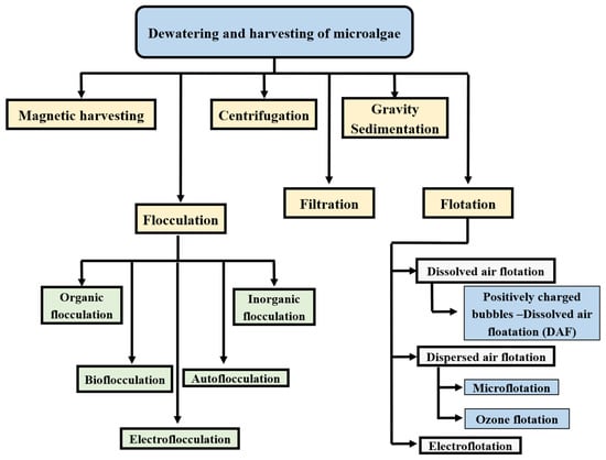 Harvesting and dewatering is the process to eliminate water from the initial microalgal culture to acceptable solid content. This step is highly challenging as it involves handling of large water quantities, due to the dilute nature of microalgae culture; typically having low biomass concentration (less than 1 g/L), depending on the cultivation method [52]. Microalgae have a similar density of water, have a negatively charged surface, and are stable, which further adds to the challenge [53]. Hence, ideal dewatering and harvesting methods must be able to attain high biomass concentration and be suitable for most microalgae strains. There are several types of microalgae dewatering and harvesting techniques, that have been developed from various studies. Figure 1 illustrates the conventional dewatering and harvesting methods for microalgae culture available in the literature.
