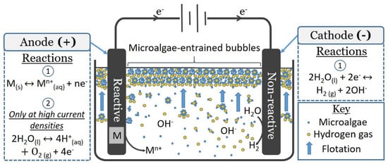 Electroflotation is a variant of the flotation technique that utilizes an electrode system with the passage of electricity to generate microbubbles (17–50 µm in diameter [67]) to entrain suspended microalgal particles via collision and adhesion [68], which consequently causes floating due to buoyancy effects as shown in Figure 2. Electroflotation is one of three main electrolytic (electrochemical) dewatering techniques, where the others are electrocoagulation and electroflocculation, that are highlighted as harboring the potential for large-scale dewatering of microalgal cultures at lower energy, lower costs, higher efficiency, and easier operation, compared to several conventional approaches [69]. However, the literature is replete with the loose usage of the aforementioned terms associated with electrolytic dewatering techniques, which has led to warranted confusion. A description, given by Uduman et al. (2010) [55], which was cited over 1105 times (google scholar as of 1 November 2020) and referenced by National Alliance for Advanced Biofuels and Bioproducts (NAABB), distinguishes electroflotation from the other electrolytic techniques based on the electrode system, which determines the dominant products or half-reactions at each electrode, and the primary function of the setup as shown in Table 5 [69,70]. Thus, they define electroflotation as an electrically driven method that uses a reactive metal anode and an inactive or inert metal cathode, respectively, generates metal ions in situ, and creates hydrogen bubbles from the electrolysis of water [69]. The principal reactions that occur at the electrodes along with a general description of the electroflotation process are shown in Figure 2. Oxygen evolution for this setup occurs at higher current densities [71]. Notwithstanding that, electroflotation is intrinsically tied to electrocoagulation and electroflocculation due to the accompanying water electrolysis, which generates microbubbles, probably to a lesser extent, that ultimately float some microalgae particles [72].