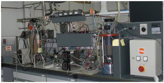 Figure 2 shows the two serially arranged bioreactors used to conduct the experiments. The reactors were two 8 L Acetators from Heinrich Frings GmbH & Co. KG (Rheinbach, Germany) equipped with self-aspirating turbines in the bottom in order to obtain a dispersion of fine air bubbles. The reactors were highly efficient in transferring oxygen between the gas phase and the substrate []. The ensemble was interfaced to a computer for automated operation, especially with regards to loading and unloading of reactors, and monitoring of the process. This resulted in highly reproducible loading and unloading, and in efficient acquisition of data [,,].