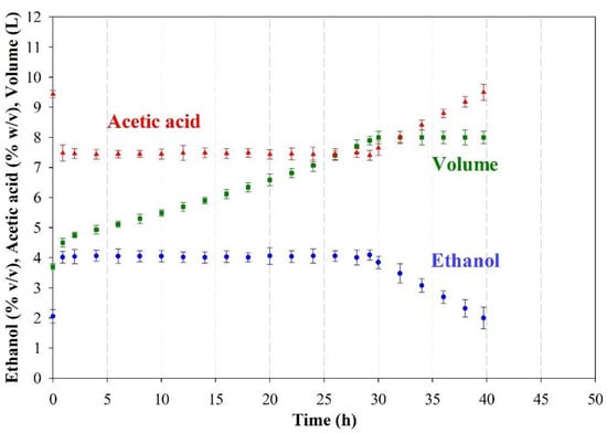 Acetification bioreactors usually operate in a semi-continuous mode. Thus, once the reactors are in full operation, the ethanol concentration is allowed to decrease to a preset level and then an also preset fraction of the reactor contents is unloaded, the remainder being allowed to stand in it in order to act as an inoculum in the next conversion cycle [,,,,]. After the bioreactor is unloaded, it is slowly replenished with a fresh alcoholic substrate to start a new ethanol depletion cycle.